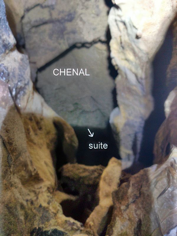 Il est très net que la cavité se poursuit derrière cet obstacle. Certes, sans doute assez étroite au départ mais en conformité avec la tendance générale de son conduit à se développer vers un parcours classique de type méandre. Et, vu le pendage vers une continuité verticale importante.